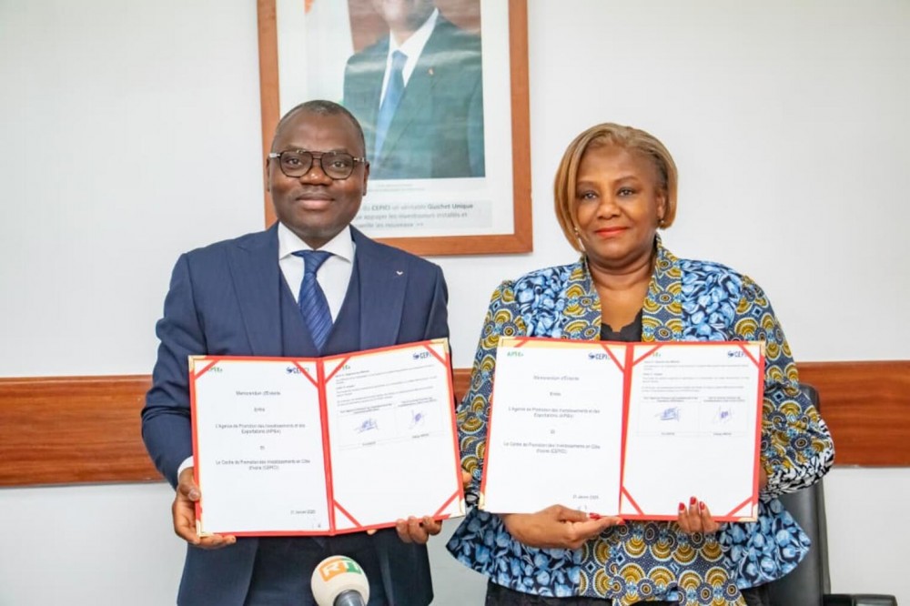 L’Agence de Promotion des Investissements et des Exportations du Bénin (APIEx) et le Centre de Promotion des Investissements en Côte d’Ivoire (CEPICI) ont procédé, ce mercredi 21 janvier 2026 à Abidjan, à la signature d’un Protocole d’Accord (MoU) visant à formaliser et renforcer leur coopération institutionnelle en matière de promotion et de facilitation des investissements.